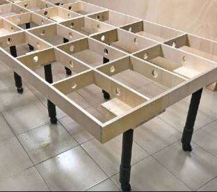 Ik heb gekozen voor een gesloten frame met openingen erin (ook wel mangat genoemd), om overal gemakkelijk bij te kunnen. Het is een houten frame bestaande uit balkjes 44x27 mm en een MDF (12 mm) plaat die de basis van de tafel vormt. Rondom de openingen is er ruimte genoeg ruimte voor zelf gemaakt modules van o.a. geluid en licht. Hier boven heb ik weer een MDF plaat (4 mm) gelegd, welke het spoortracé ondersteund. Het onderstel of te wel de poten zijn gemaakt van koker profiel, waar onder zwenk wielen zijn gemonteerd, zodat deze verrijdbaar is om gemakkelijk overal bij te kunnen.