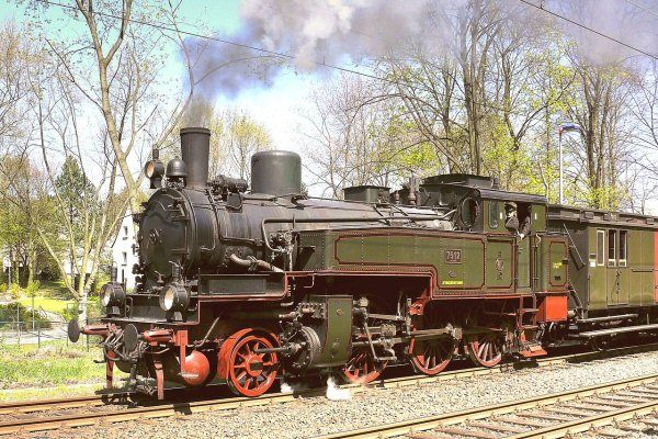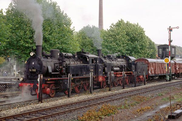 Bochum-Dahlhausen, 24 oktober 1992. Locs 74 1192 (8470 Berlin) en 38 2267 (2553 Erfurt) met een museumgoederentrein. Loc 74 1192, een Pruisische T12, is kort na deze rit buiten dienst gegaan. (Bron: nicospilt.com)